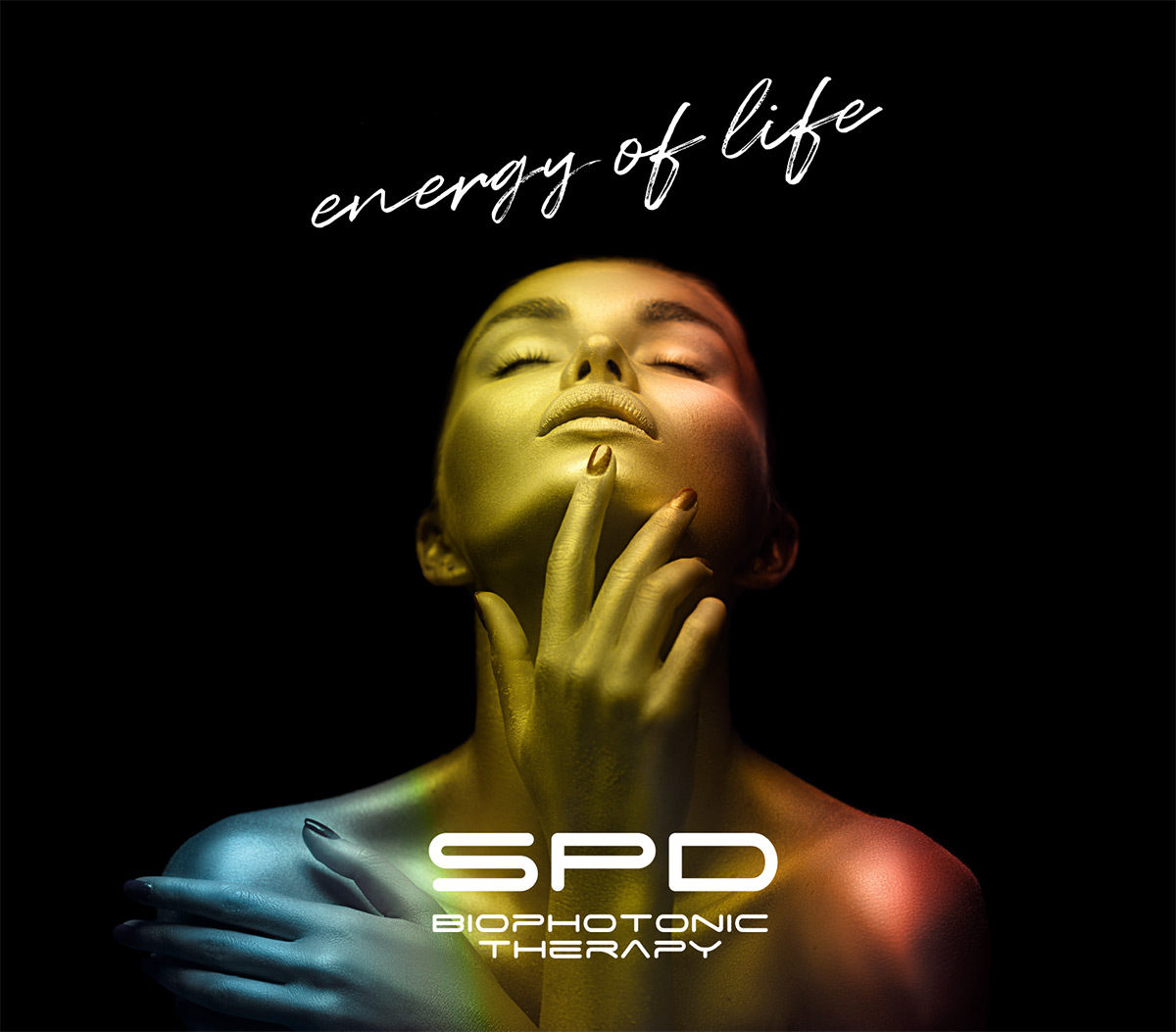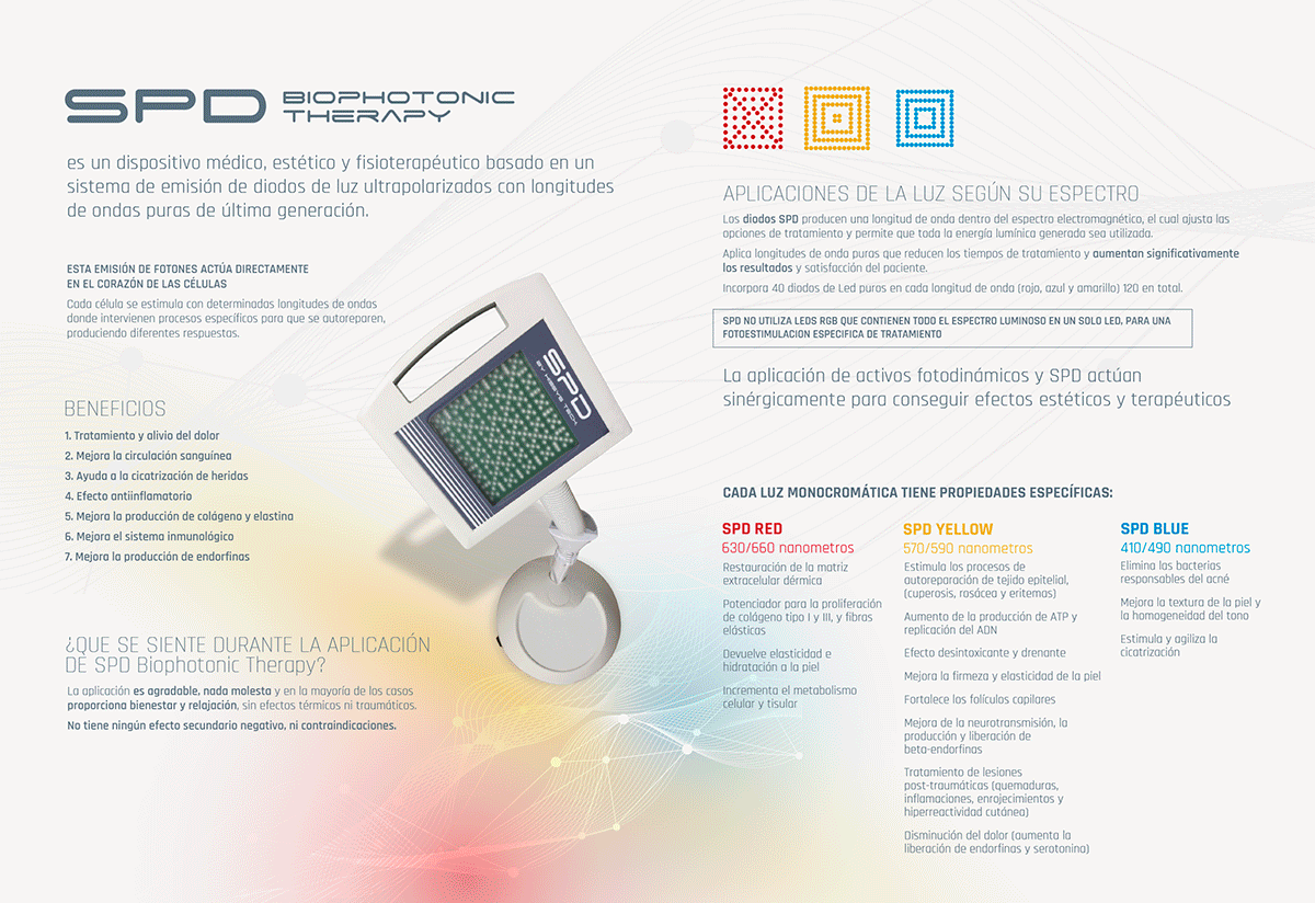 Imatge de campanya per el llançament d’un equip de tractaments d’estética facial, corporal i fisioterapia que fonamenta la seva capacitat en l’emissió de llum biofotònica.